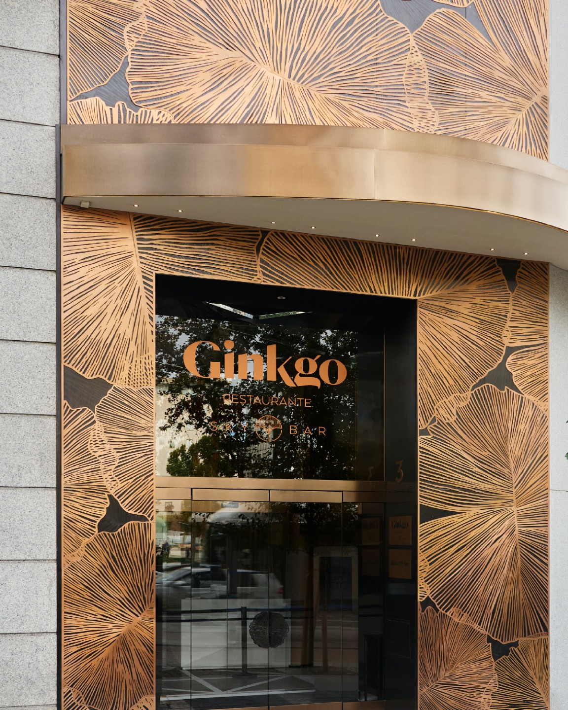 En este entorno comercial, el uso del acero inoxidable en acabado bronce pulido satinado contribuye a una recepción de alto impacto visual. La superficie curva y reflectante amplifica la iluminación y aporta una estética vanguardista al espacio, demostrando el potencial del material en proyectos de interiorismo contemporáneo.